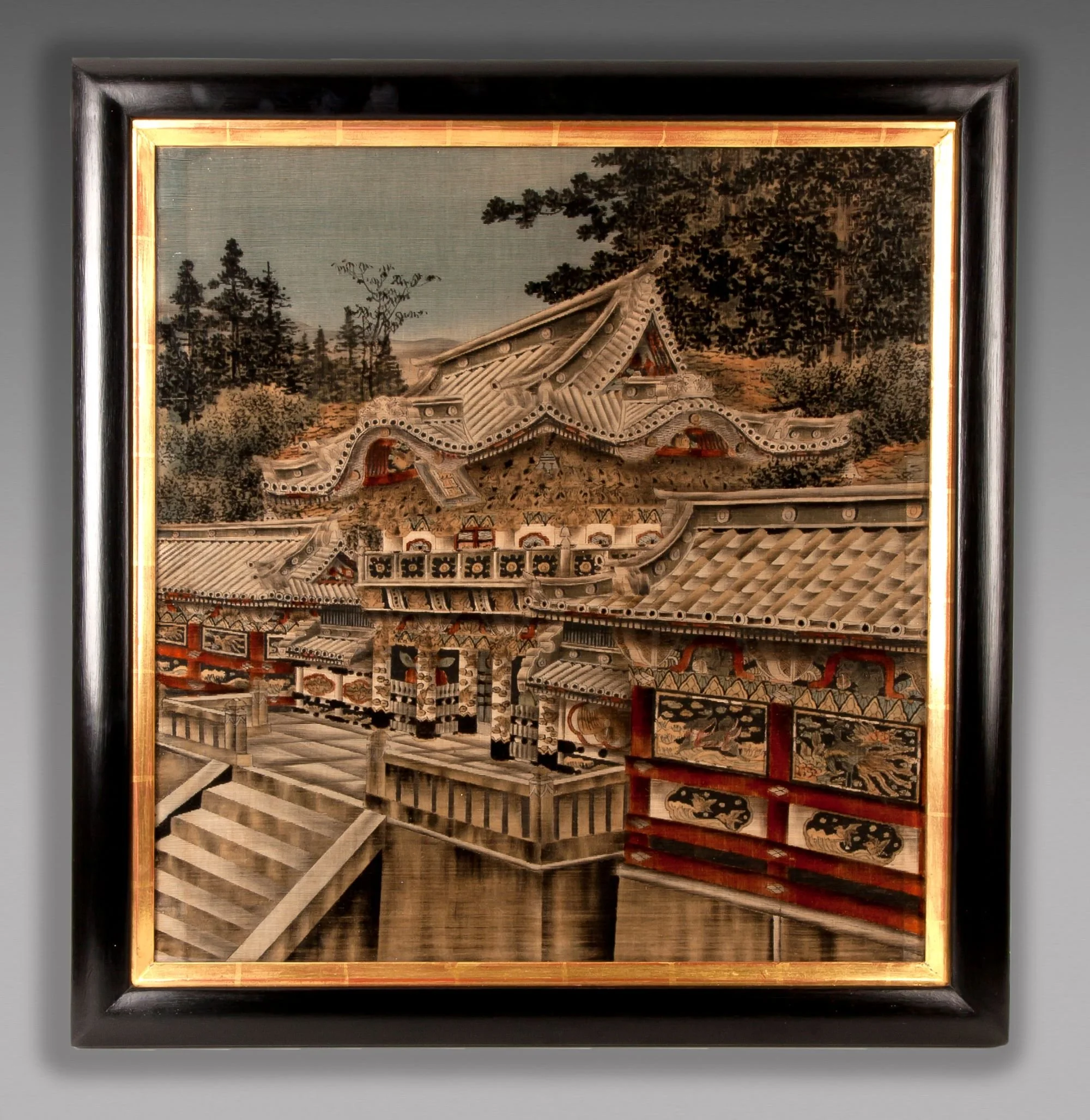 A yuzen (cut velvet) panel depicting the Yomeimon gate of the Nikko Toshogu shrine