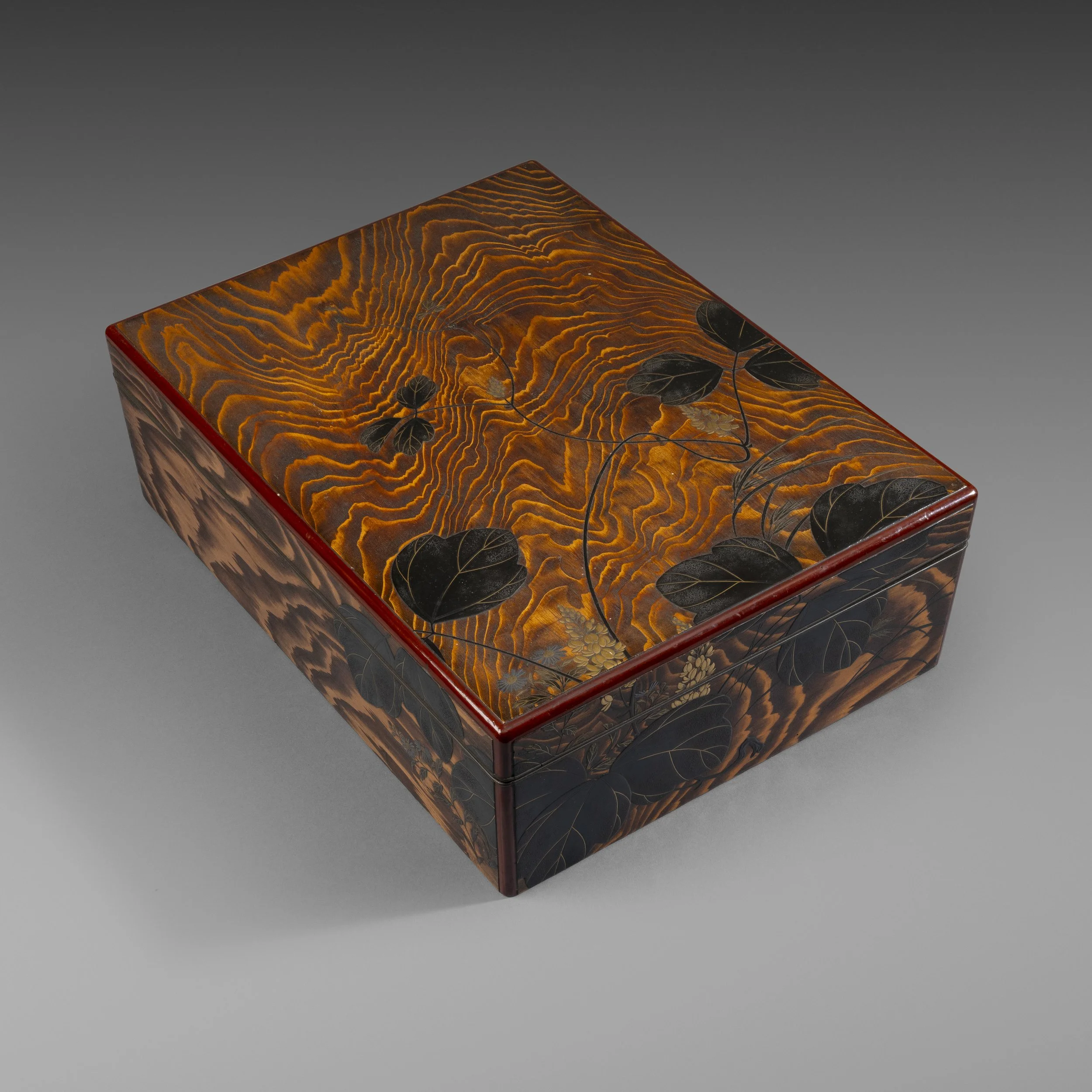 A lacquered paulownia wood ryoshibako (document box), the richly grained body worked in gold, silver and coloured hiramakie with creeping vines of flowering kudzu and autumn grasses, the interior lacquered to accentuate the wood grain, with simulated pewter rims.