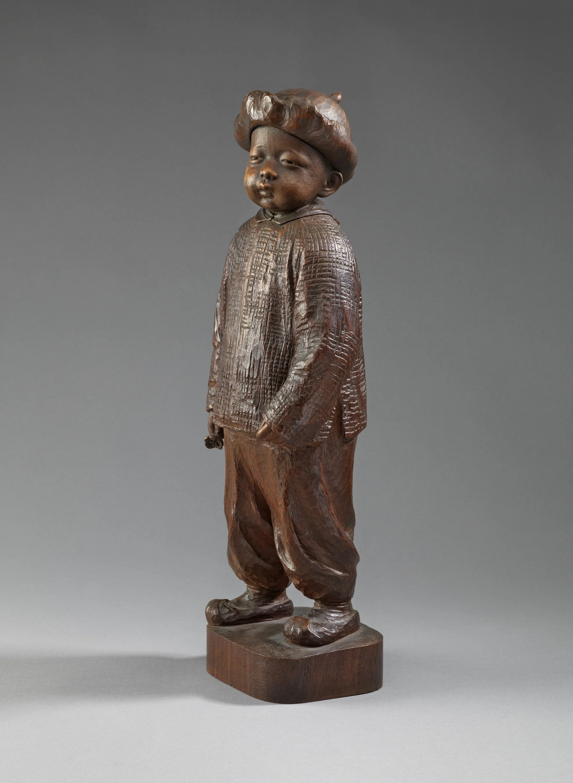 A Tokyo school wood okimono of a boy wearing a short jacket, trousers and hat bearing a dark brown patination.